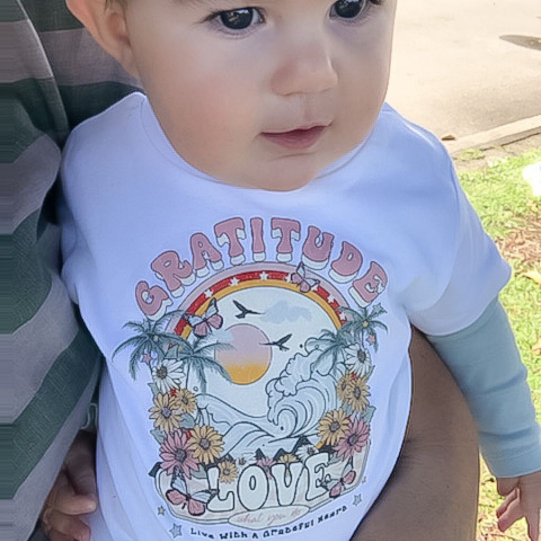 Our Gratitude + Love trendy kids tee will be loved and worn on the daily.